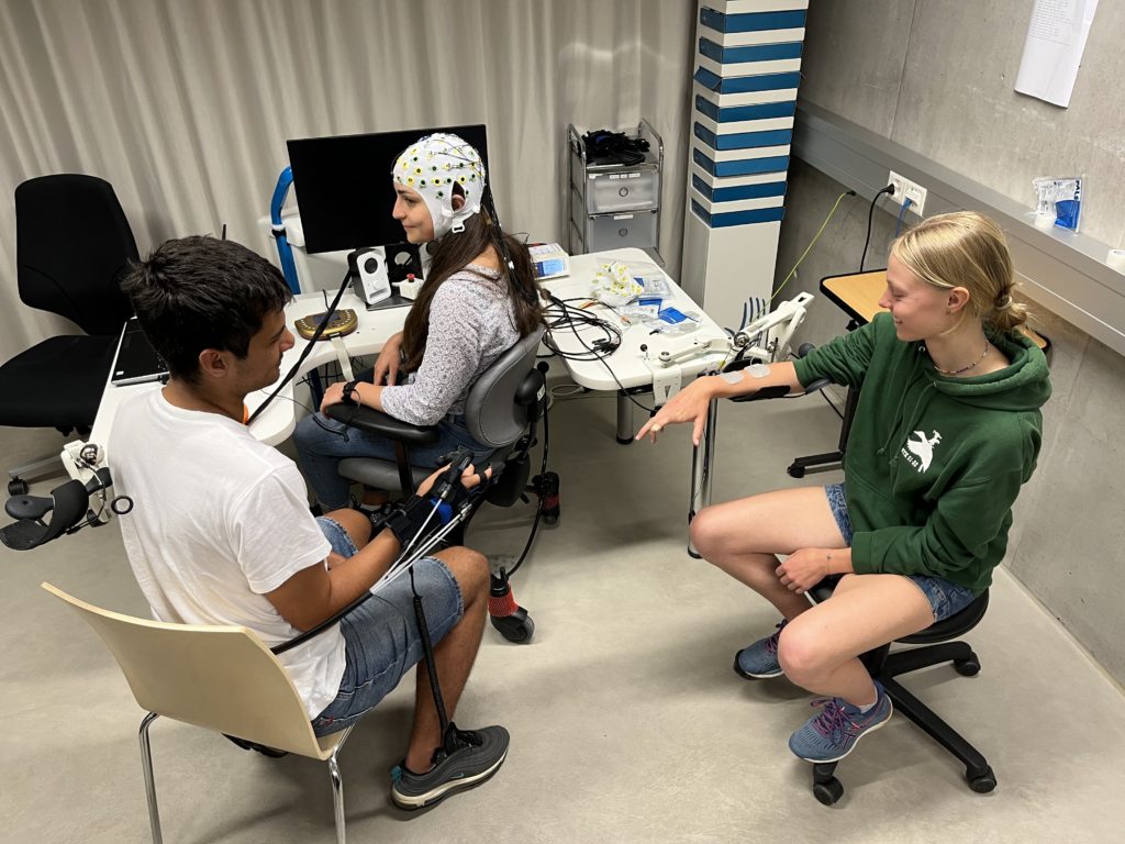 Im zweiten Atelier hat uns die Doktorandin Claudia Bigoni den sogenannten AVanCer vorgestellt. Es handelt sich hierbei um einen motorischen Rehabilitations-Handschuh, der über das Gehirn sowie über einen Roboter gesteuert werden kann. Zusätzlich haben wir das Modelling kennen gelernt, wobei es sich um eine weitere Methode der Rehabilitation motorischer Bewegungen handelt. Das Modelling ist grundsätzlich dafür da, durch die Stimulierung einer Gehirnregion die Verbindung zwischen dem Neuron und dem Muskel wiederherzustellen, zum Beispiel bei gelähmten Personen oder nach einem Schlaganfall. Die Stimulierung erfolgt über eine Elektrodenplatzierung in einer Gehirnregion (Bild: die weisse Kappe). Zusätzlich zu diesen zwei Varianten hat uns Claudia noch ein weiteres Experiment gezeigt, wobei ein Muskel durch elektrischen Strom angeregt wurde, eine Bewegung auszuführen. Das letzte Experiment konnte sogar über das Gehirn einer anderen Person gesteuert werden (hier im Bild, über die Frau mit der Kappe).